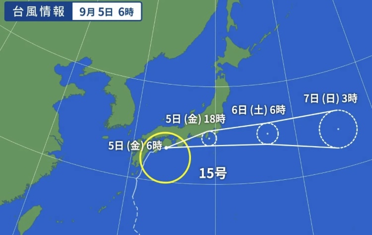 台風15号は、5日(金)午前6時現在、安芸市付近にあって、時速25キロで東北東へ進んでいます。